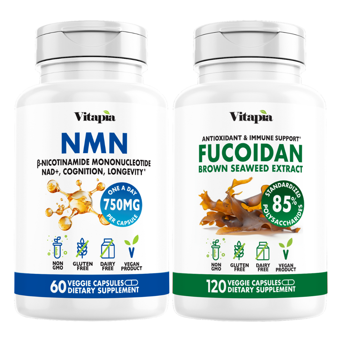 Take 1 veggie capsule of NMN & 2 veggie capsules of Fucoidan daily with meal and at least 8oz of water, or as recommended by a licensed healthcare practitioner.